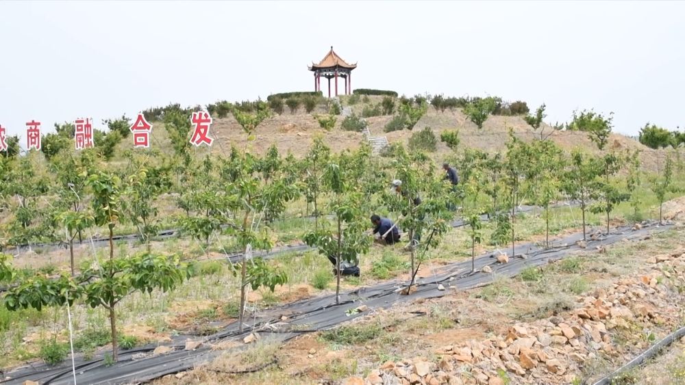 在淄博市沂源縣魯村鎮(zhèn)龍子峪村酥梨園,工作人員在進(jìn)行夏季管護(hù)。幾年前這里還是一座荒山,2022年,沂源桃花島農(nóng)業(yè)發(fā)展有限公司流轉(zhuǎn)了這片山地,改造為酥梨園。