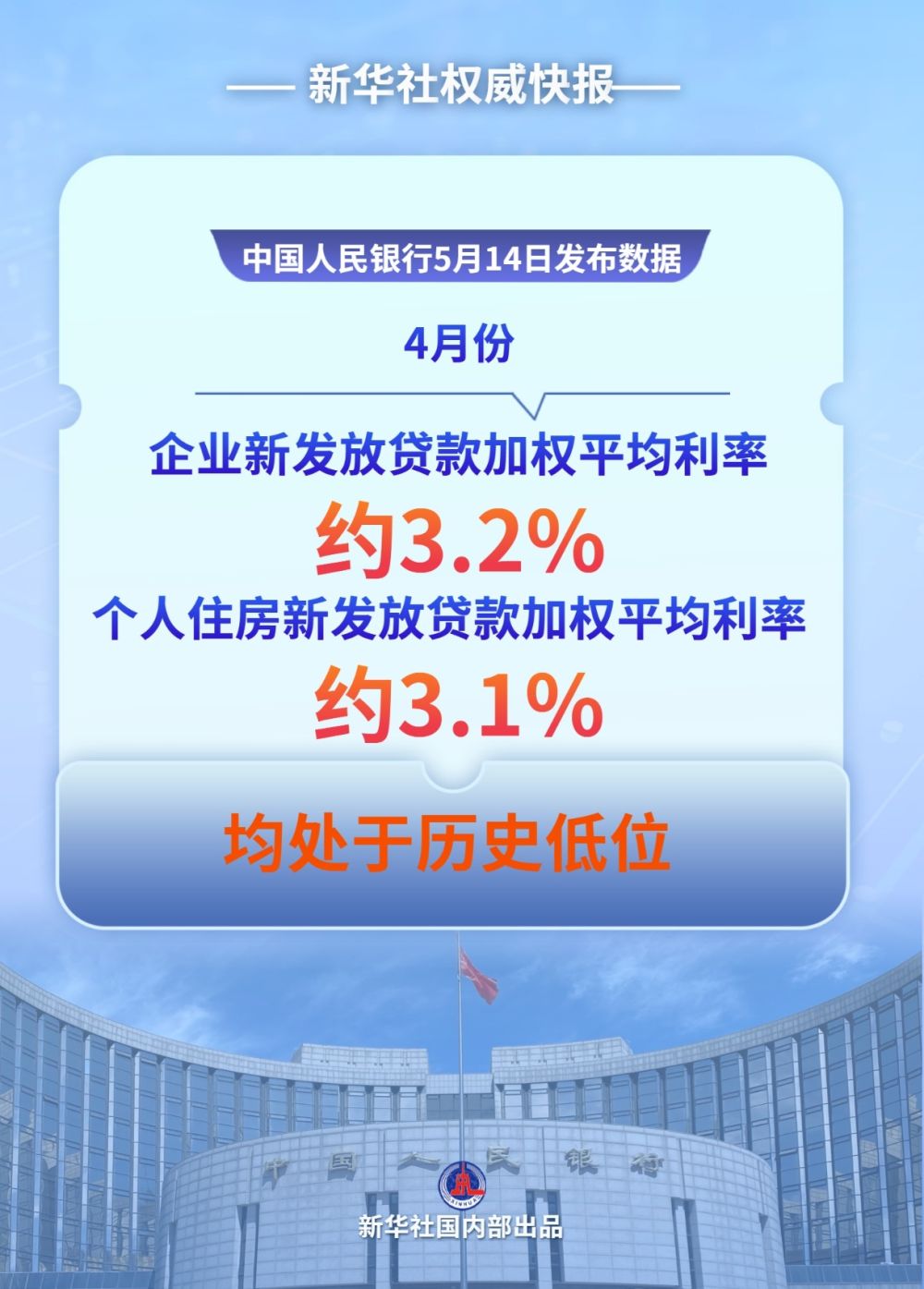 中國人民銀行的數(shù)據(jù)顯示,4月份,企業(yè)新發(fā)放貸款加權平均利率約3.2%,比上年同期低約50個基點;個人住房新發(fā)放貸款加權平均利率約3.1%,比上年同期低約55個基點,均處于歷史低位。