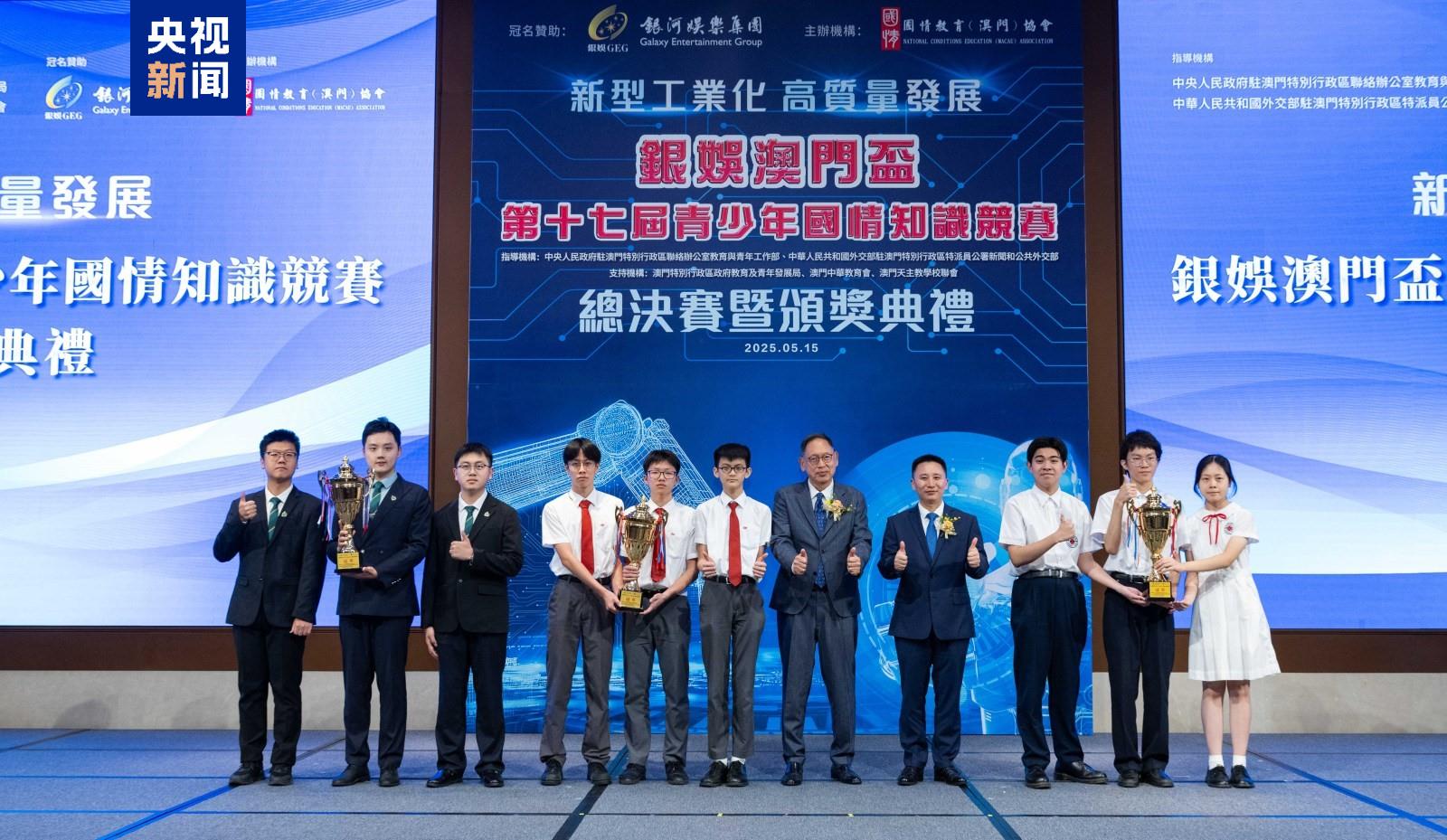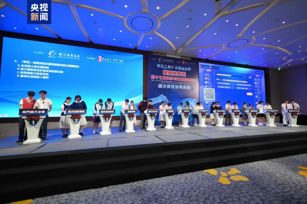 澳門第十七屆青少年國情知識(shí)競(jìng)賽總決賽暨頒獎(jiǎng)典禮15日舉行。本屆賽事共吸引了澳門26所中學(xué)和8所高等院校逾15000名學(xué)生踴躍參與,規(guī)模再創(chuàng)新高。培道中學(xué)、鏡平學(xué)校和澳門理工大學(xué)分別奪得兩個(gè)中學(xué)組和一個(gè)大學(xué)組冠軍。