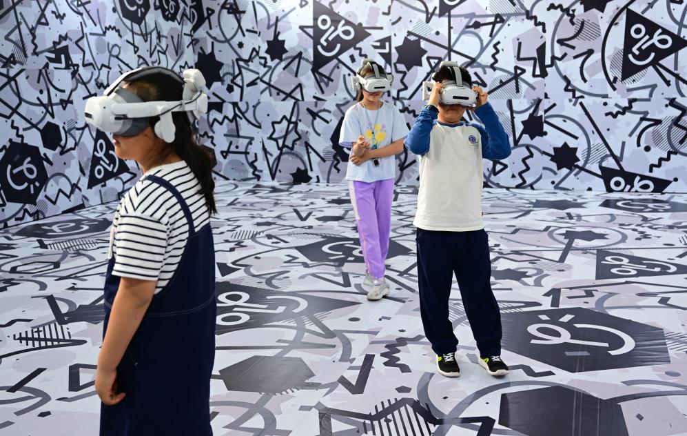 4月26日,小朋友們在第三屆中國(安徽)科技創(chuàng)新成果轉(zhuǎn)化交易會(huì)上體驗(yàn)VR設(shè)備。新華社記者 周牧 攝