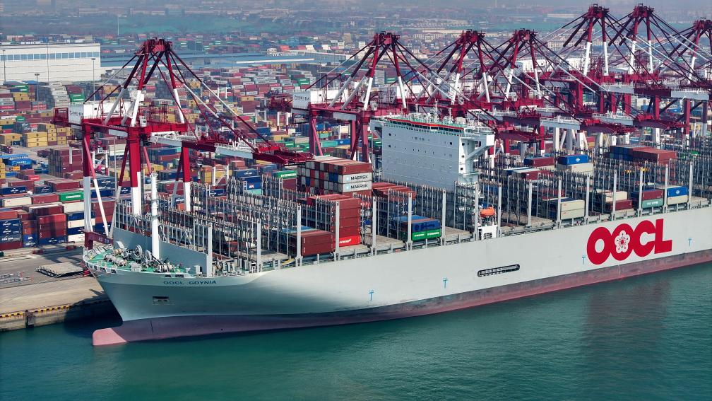 4月10日,一艘集裝箱貨輪在山東港口青島港前灣集裝箱碼頭進行裝卸作業(yè)(無人機照片)。新華社記者 李紫恒 攝