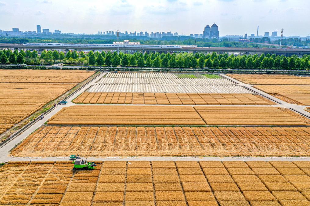 5月20日,在江蘇里下河地區(qū)農(nóng)科所(揚州市農(nóng)科院)試驗田,農(nóng)民駕駛收割機收割小麥(無人機照片)。新華社發(fā)(任飛攝)