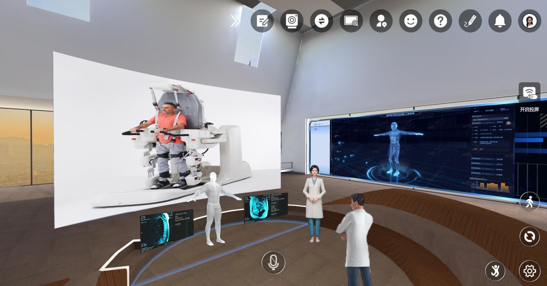 “就像推開一扇通往平行世界的門,這種‘在場感’是傳統(tǒng)遠(yuǎn)程協(xié)作難以企及的?!本S賽客首席運(yùn)營官徐晨翔邊演示邊解釋道。他調(diào)出了VS·work中的“智聯(lián)康復(fù)元診療平臺”——這是維賽客在醫(yī)療元宇宙領(lǐng)域的創(chuàng)新應(yīng)用,集成了病情診療、康復(fù)訓(xùn)練、社交培訓(xùn)等功能。在虛擬界面中,醫(yī)生可以通過高精度空間定位系統(tǒng)“走進(jìn)”患者的虛擬診療室,患者則通過可穿戴設(shè)備完成肌力評估、平衡訓(xùn)練等動作,數(shù)據(jù)實時反饋至醫(yī)生終端,為偏遠(yuǎn)地區(qū)的患者提供了更加便捷、高效的診療服務(wù)。