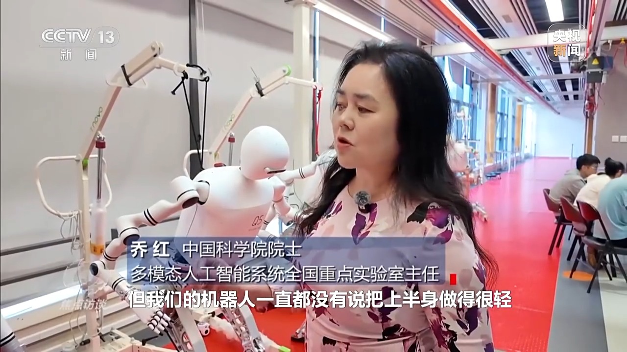 中國(guó)科學(xué)院院士、多模態(tài)人工智能系統(tǒng)全國(guó)重點(diǎn)實(shí)驗(yàn)室主任 喬紅:人形機(jī)器人都是自由度(關(guān)節(jié))比較多,但我們的機(jī)器人一直都沒(méi)有把上半身做得很輕,因?yàn)樗且鳂I(yè)的、干活的,所以沒(méi)有專(zhuān)門(mén)追逐要跑得快,跑得快也是我們的期望,現(xiàn)在也能跑2.2米每秒。