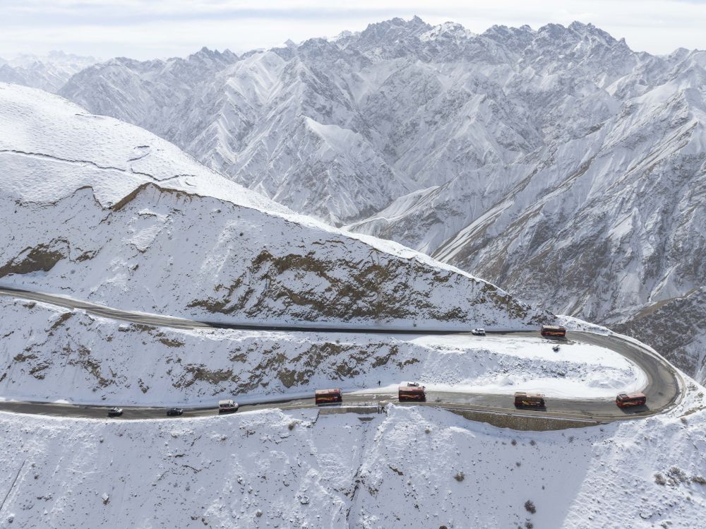 在新疆塔什庫爾干塔吉克自治縣,參加“盤龍古道”恢復通車儀式的車隊在行進中(2025年3月22日攝)。新華社記者 徐宏巖 攝