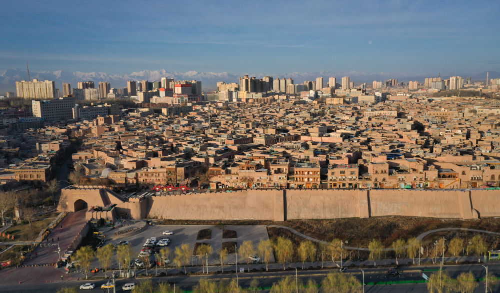 清晨,灑滿陽光的喀什古城(2023年3月10日,無人機拍攝)。新華社記者 李響 攝
