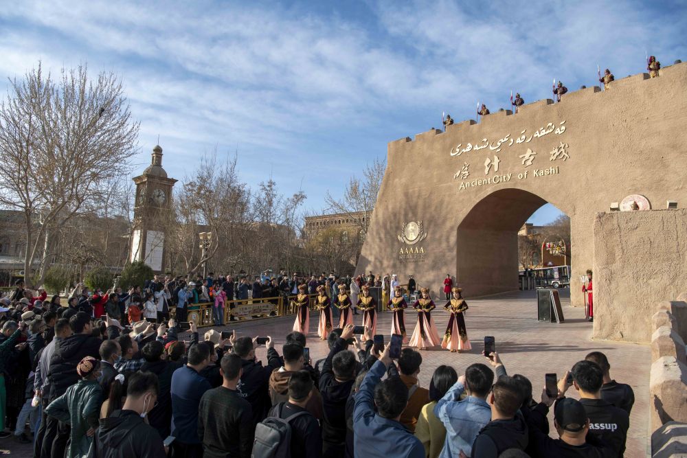 游客在新疆喀什古城景區(qū)東大門觀看“開城儀式”(2023年3月10日攝)。新華社記者 胡虎虎 攝