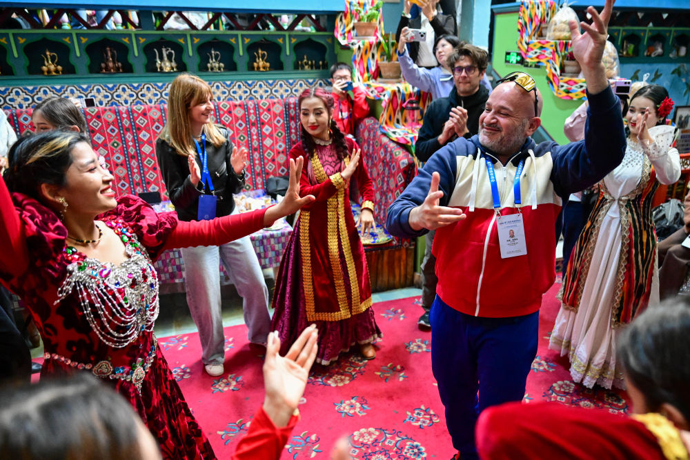 在新疆喀什古城景區(qū)“古麗的家”旅游家訪點,第六屆世界媒體峰會的與會嘉賓和當?shù)鼐用褚黄鹞璧福?024年10月16日攝)。新華社記者 丁磊 攝