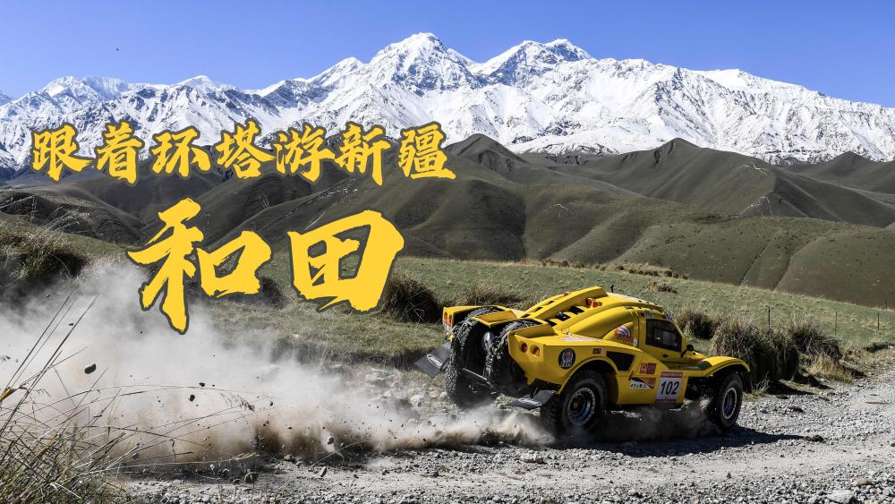 一輛環(huán)塔賽車疾馳在賽道上,遠處的昆侖雪山清晰可見(無人機拍攝)