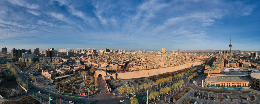 ↑清晨的喀什古城(2023年3月10日攝,無人機照片)。新華社記者 李響 攝