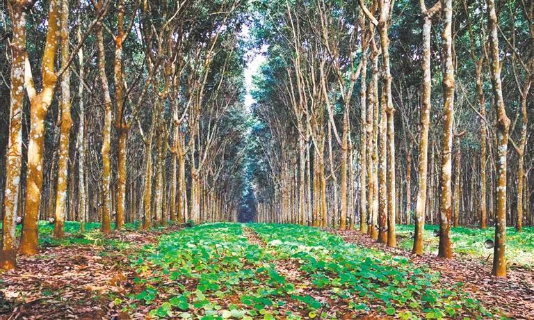 在距離西雙版納傣族自治州景洪市環(huán)城北路約1公里處,記者見到云南省熱帶作物科學研究所占地1054畝的環(huán)境友好型生態(tài)膠園千畝試驗示范基地。這里將橡膠樹種植行距從傳統(tǒng)8米擴大到20米以上,在橡膠樹間套種上述經(jīng)濟作物。如此布局,即使橡膠行情不好,經(jīng)過精心篩選套種的其他經(jīng)濟作物也能取得不錯的經(jīng)濟效益。