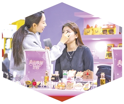 在上海舉辦的中國美容博覽會上,客商親身體驗(yàn)化妝。