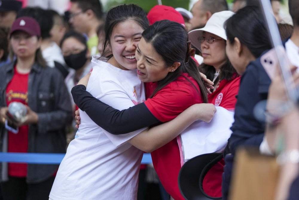 6月7日,在哈爾濱市第九中學考點,考生走入考場前與老師擁抱。(新華社記者 王建威 攝)
