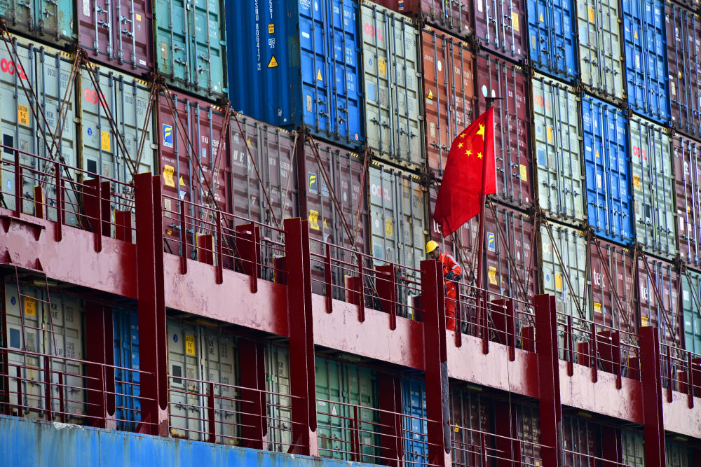 4月30日,工人在“中遠(yuǎn)新寧波”輪船尾進(jìn)行貨柜堆放安全檢查。新華社記者 李紫恒 攝