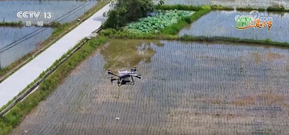 在另一塊稻田里,植保無人機正在對剛插好的稻苗噴灑肥料。農場負責人表示,單季稻插秧后3—7天,就需要根據稻苗返青和分蘗的情況施肥,以促進它的生長。用無人機施肥可精準控制用量,一天能管200多畝,同時,還能節(jié)省30%的肥料。