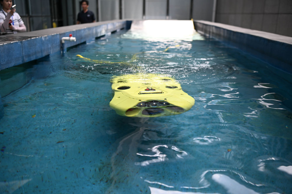在長方形的測試水池里,一臺明黃色的“鐵疙瘩”時而浮出水面,時而沉入水底,看似笨重的身軀卻靈活得仿佛一條游動的魚。這款用于水下檢測的智能機(jī)器人,可以在“一沉一浮”間實現(xiàn)對水下情況全方位、無死角的探測作業(yè)。