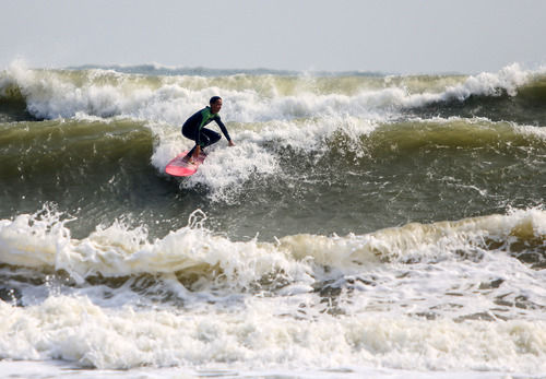 一名沖浪運(yùn)動(dòng)員在“逐浪前行”。(陳史攝)