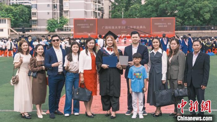 在廣西科技大學(xué)27日舉行的畢業(yè)典禮上,老撾留學(xué)生馬麗文成為全場(chǎng)焦點(diǎn):她的父母、兄弟等十位親人跨國(guó)而來(lái),見(jiàn)證這一重要時(shí)刻?!爱?dāng)家人手捧鮮花向我走來(lái),我緊緊擁抱住他們,感謝他們支持我的夢(mèng)想。”馬麗文說(shuō)。