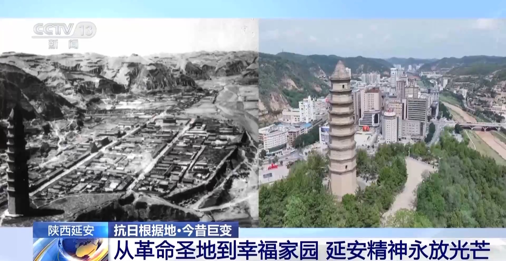 說到延安,很多人自然就會(huì)想到巍巍寶塔山,這張照片就是拍攝于80多年前的寶塔山上。當(dāng)時(shí),城里大多是低矮的平房。如今從同一個(gè)位置俯瞰,這里已經(jīng)發(fā)生了翻天覆地的巨變——延河兩岸,高樓大廈拔地而起,鱗次櫛比的現(xiàn)代化新城矗立眼前。