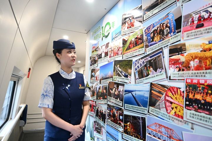 6月25日,中國(guó)鐵路南昌局集團(tuán)有限公司福州客運(yùn)段列車長(zhǎng)李曉若在 G3089次動(dòng)車上介紹合福高鐵開(kāi)通十年來(lái)留下的美好故事。