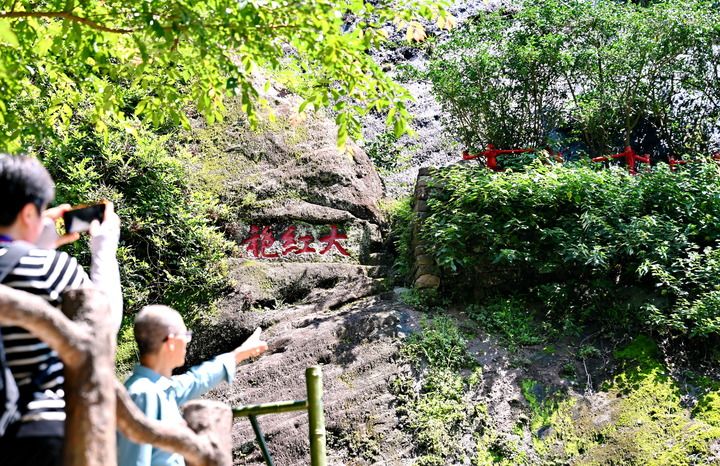 6月25日,游客在福建武夷山風(fēng)景名勝區(qū)參觀生長(zhǎng)在武夷山九龍窠高巖峭壁上的大紅袍茶樹(shù)母株。