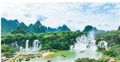 更為奇妙的是,中越德天(板約)瀑布大部分時(shí)間看起來像兩座瀑布,但匯入同一水潭。夏日豐水季節(jié),兩座瀑布更是連為一體,昭示著瀑分兩國、情卻相依。一直以來,當(dāng)?shù)刂性絻蓢吤裾Z言相通、習(xí)俗相近,“同打一山柴,共飲一河水”。如今,成為中國第一個(gè)跨境旅游合作區(qū)的德天(板約)瀑布展露風(fēng)姿吸引八方賓客,民心相通的涓涓溪流在歸春河的哺育下,匯聚成滔滔大潮。