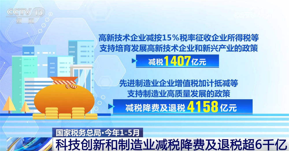 數據顯示,今年1—5月,現(xiàn)行支持科技創(chuàng)新和制造業(yè)發(fā)展的主要政策減稅降費及退稅達6361億元。其中,高新技術企業(yè)減按15%稅率征收企業(yè)所得稅等支持培育發(fā)展高新技術企業(yè)和新興產業(yè)的政策減稅1407億元;先進制造業(yè)企業(yè)增值稅加計抵減等支持制造業(yè)高質量發(fā)展的政策減稅降費及退稅4158億元。