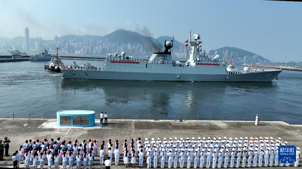 儀式結(jié)束后,湛江艦、運(yùn)城艦響起清脆的海軍笛,官兵們在舷邊分區(qū)列隊,向碼頭上的人群揮手致意,兩艘艦艇駛離昂船洲軍營碼頭,前往預(yù)定海域與山東艦、延安艦會合。香港特區(qū)直升機(jī)、船隊一路引航伴航,護(hù)送編隊駛出區(qū)界。