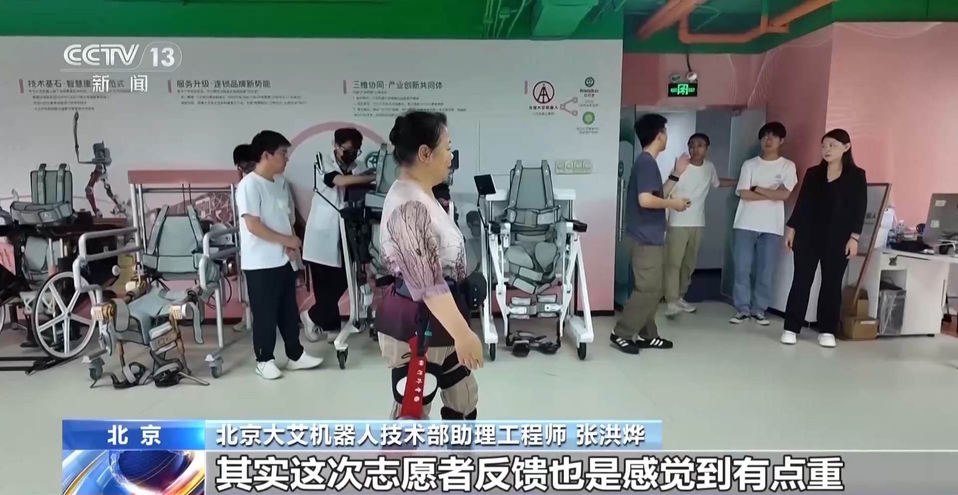 北京大艾機器人技術部助理工程師 張洪燁:在穿戴方面,老人其實更希望是讓它更簡單、更易上手,能自己獨立完成穿戴。在配重方面,其實這次志愿者反饋也是感覺到有點重,我們后續(xù)應該是再減重。