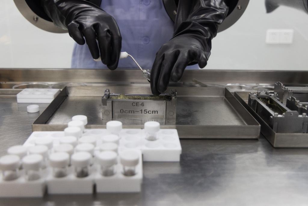2024年9月24日,科研人員在月球樣品實(shí)驗(yàn)室的解封操作臺上處理嫦娥六號月球樣品。 新華社記者 金立旺 攝