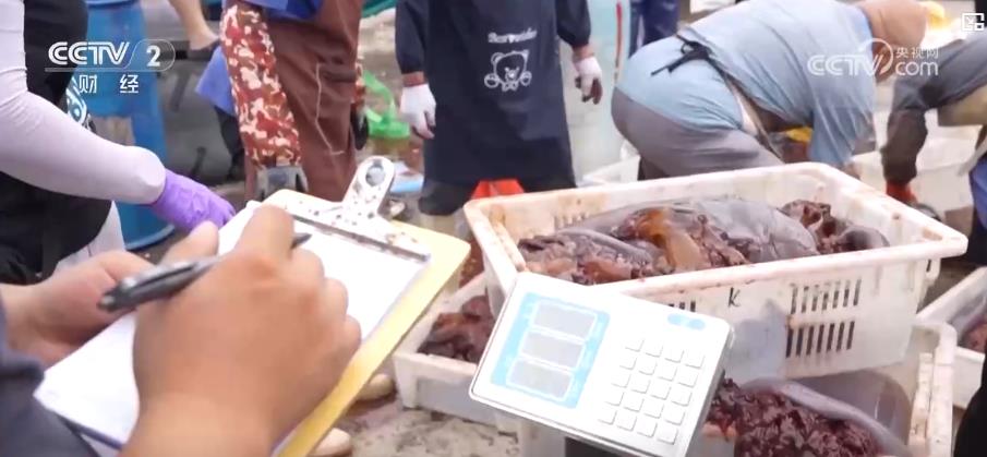 在南漁港碼頭,漁船剛一???,漁民們便爭分奪秒地卸貨、稱重。今年,在煙臺龍口海蜇專項(xiàng)捕撈期,共有41艘漁船成功辦理了海蜇專項(xiàng)捕撈許可證,得以出海作業(yè)。