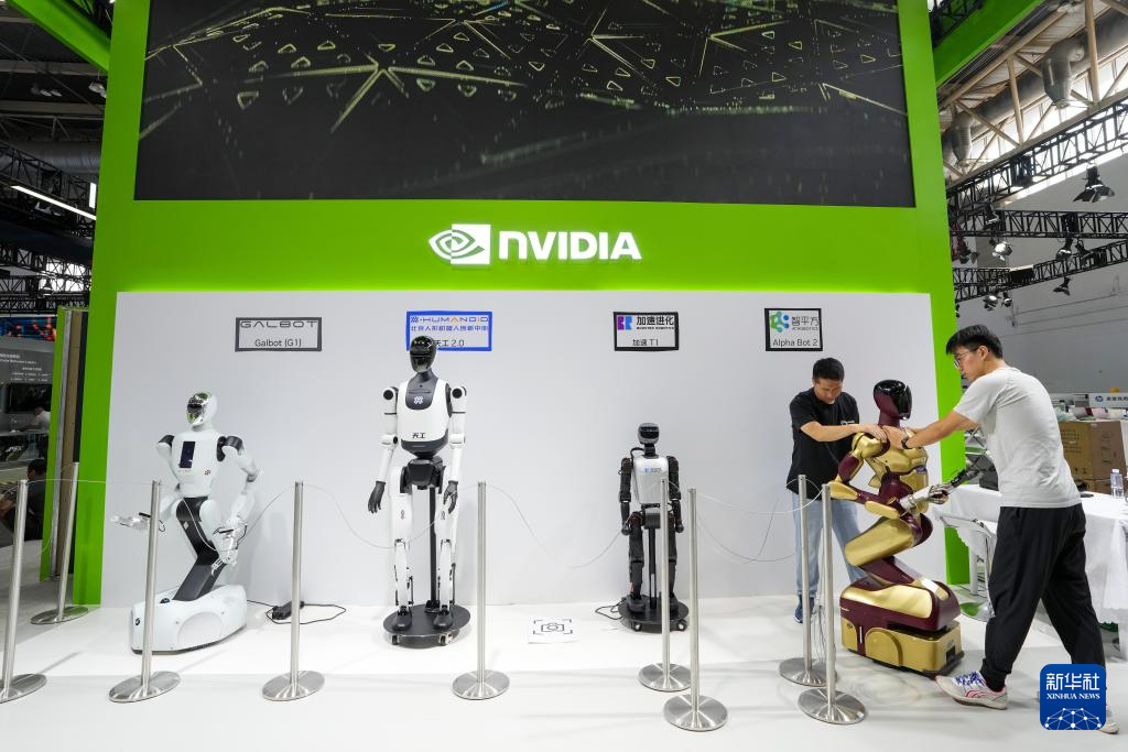 7月14日,在第三屆中國國際供應(yīng)鏈促進(jìn)博覽會(huì)數(shù)字科技鏈展區(qū)英偉達(dá)公司展位,工作人員在布置展品。