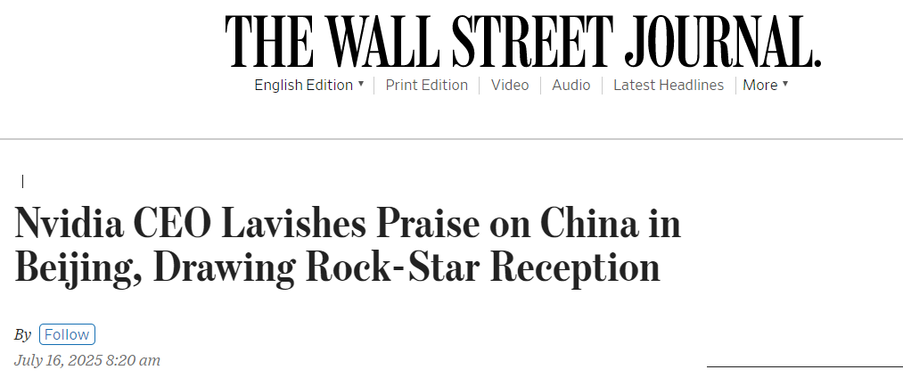 美國《華爾街日?qǐng)?bào)》報(bào)道稱,市值達(dá)4萬億美元的AI芯片公司掌門人黃仁勛在訪問北京期間多次表達(dá)對(duì)中國的贊賞,盛贊中國的科技進(jìn)步。
