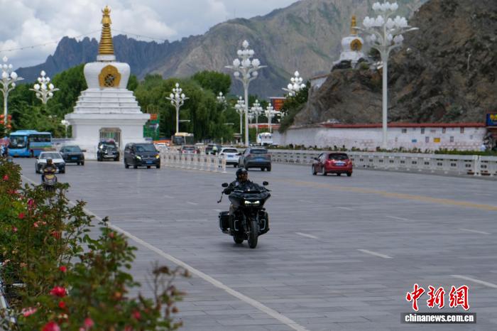 7月21日,一位騎士騎著重型摩托車途經拉薩北京中路白塔附近。中新社記者 江飛波 攝