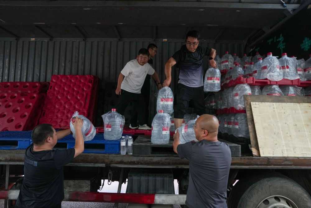 7月27日,在北京市密云區(qū)石城鎮(zhèn)中心小學(xué)安置點(diǎn),工作人員在卸物資。新華社記者 鞠煥宗 攝