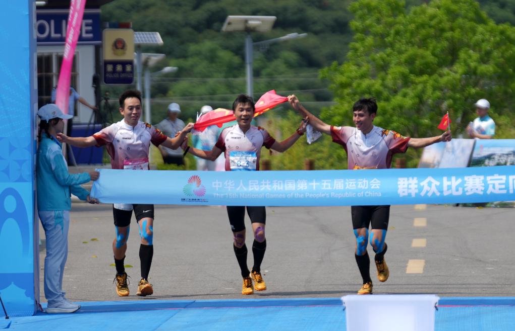 5月8日,廣東隊選手李卓業(yè)(中)、唐建達(左)、唐瀟在男子定向接力賽中沖向終點。當日,第十五屆全國運動會群眾賽事活動定向接力賽決賽在廣東省茂名市高州根子鎮(zhèn)舉行。新華社記者 黃國保 攝