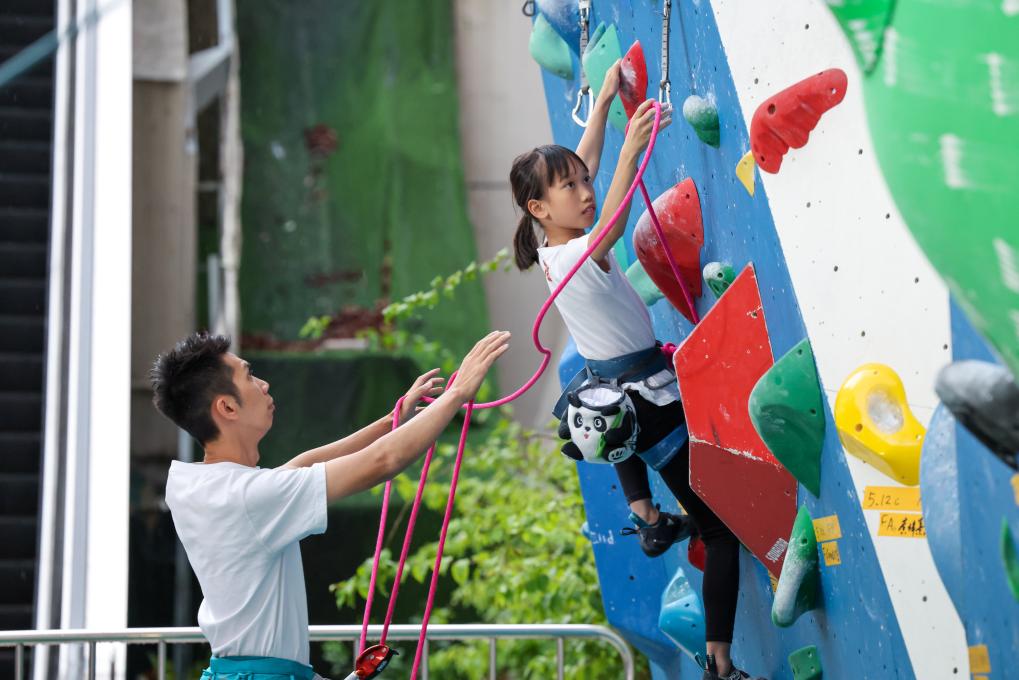 圖為在深圳福田區(qū)呢度有家攀巖館,來自中國香港的9歲女孩何芊芊(右)在爸爸何善揮的保護下開始難度攀巖訓練(6月17日攝)。新華社記者 梁旭 攝