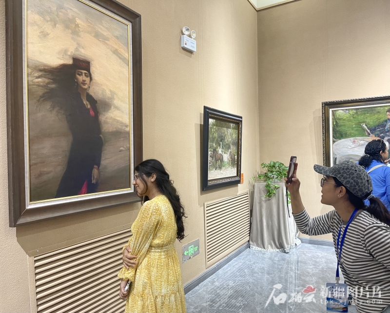 8月2日,北京大學(xué)留學(xué)生在油畫(huà)作品前打卡拍照。石榴云/新疆日?qǐng)?bào)記者 趙西婭攝