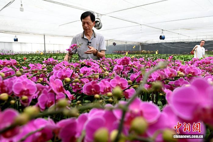 7月16日,臺(tái)胞王耀宗在位于福建漳州市南靖縣的天農(nóng)蘭花園里查看蝴蝶蘭長(zhǎng)勢(shì)?!≈行戮W(wǎng)記者 呂明 攝