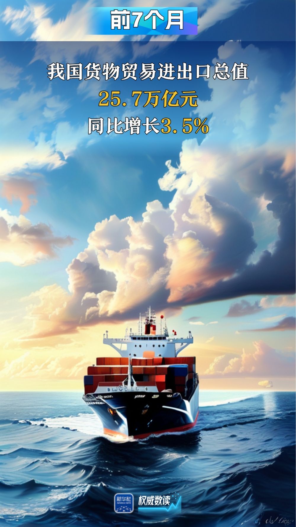 海關(guān)總署7日發(fā)布數(shù)據(jù)顯示,今年前7個月,我國貨物貿(mào)易進(jìn)出口總值25.7萬億元人民幣,同比增長3.5%。面對復(fù)雜外部環(huán)境,我國外貿(mào)運(yùn)行保持向上向好勢頭,經(jīng)濟(jì)運(yùn)行穩(wěn)中有進(jìn)。