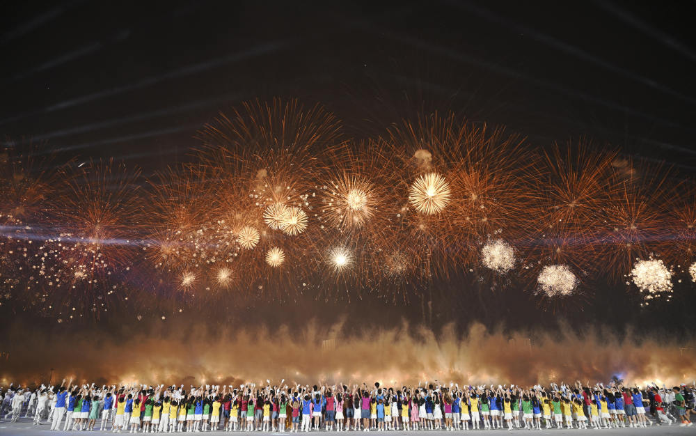 這是8月7日拍攝的開幕式上的焰火表演。新華社記者 陳振海 攝