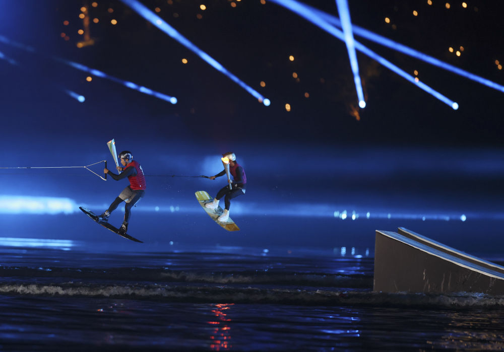 開幕式接近尾聲,中國滑水運(yùn)動員以滑水的方式疾馳于湖上,共同點(diǎn)燃主火炬,水火交相輝映,現(xiàn)場再次沸騰。