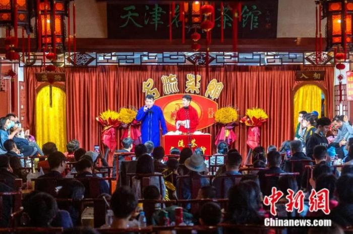 圖為游客在天津名流茶館感受傳統(tǒng)相聲文化