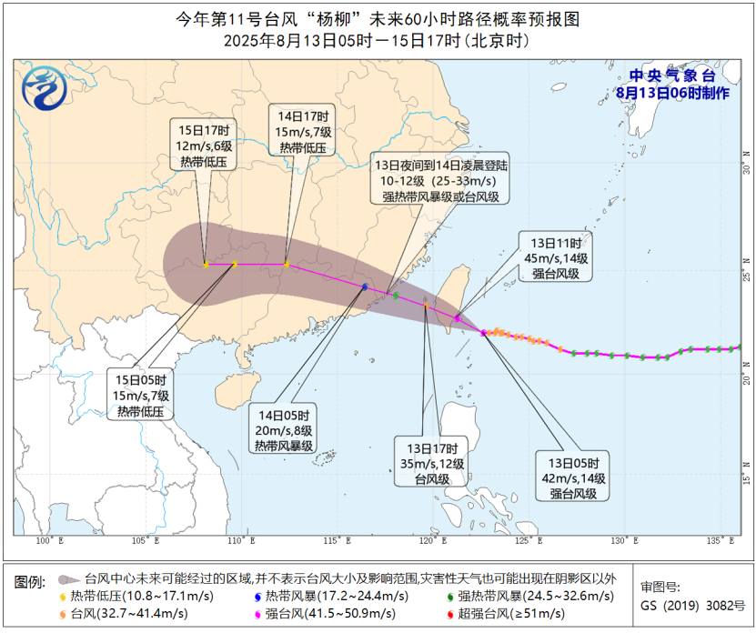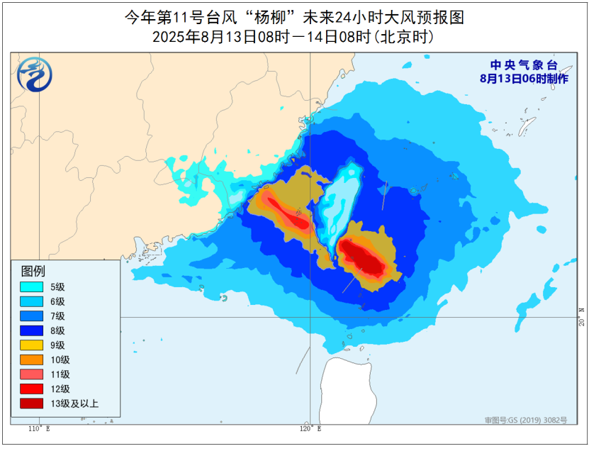 大風(fēng)預(yù)報(bào):8月13日08時(shí)至14日08時(shí),東海南部、臺(tái)灣以東洋面、南海東北部、巴士海峽、臺(tái)灣海峽、臺(tái)灣島北部及其沿海、福建北部沿海、廣東中東部沿海將有6~8級(jí)大風(fēng),臺(tái)灣島南部及其沿海、福建中南部沿海、臺(tái)灣東南洋面、臺(tái)灣海峽和巴士海峽的部分海域風(fēng)力可達(dá)9~10級(jí),臺(tái)風(fēng)中心經(jīng)過(guò)的附近海域和地區(qū)風(fēng)力有11~14級(jí),陣風(fēng)15-16級(jí)。
