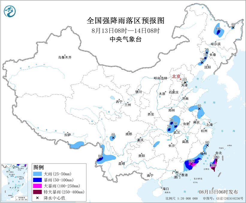 預(yù)計(jì),8月13日08時(shí)至14日08時(shí),黑龍江中部、吉林西部、遼寧西部、河南南部、湖北中部、江蘇北部、云南西部、廣東東部、福建東部和南部、西藏南部、臺(tái)灣島大部等地部分地區(qū)有大到暴雨,其中,福建東南部、廣東東南部、臺(tái)灣島東部和南部等地部分地區(qū)有大暴雨,臺(tái)灣島東部和南部等地局地特大暴雨(250~390毫米)。上述部分地區(qū)伴有短時(shí)強(qiáng)降水(最大小時(shí)降雨量20~50毫米,局地可超過(guò)70毫米),局地有雷暴大風(fēng)等強(qiáng)對(duì)流天氣。