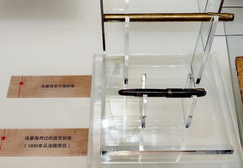 延安文藝紀(jì)念館展出的冼星海使用過的指揮棒和鋼筆。新華社記者 孫正好 攝