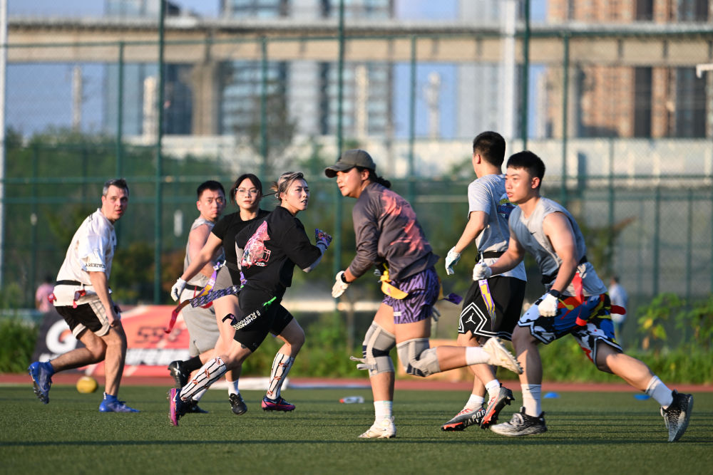 7月27日,在成都工作生活的運(yùn)動愛好者吳慶文(左四)在腰旗橄欖球比賽中。新華社記者 胥冰潔 攝