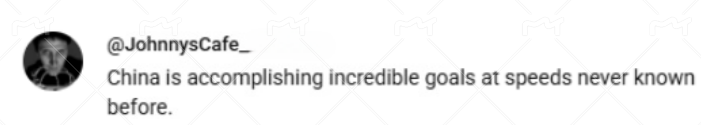 網(wǎng)友@JohnnysCafe_表示,“中國正在以前所未有的速度實(shí)現(xiàn)令人難以置信的目標(biāo)?!?/p>
