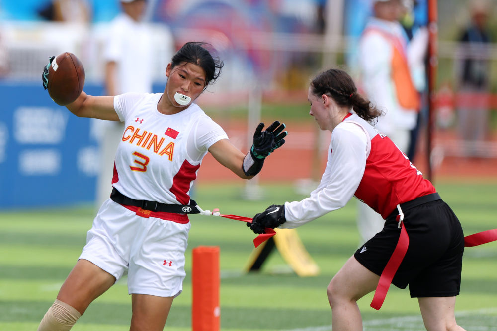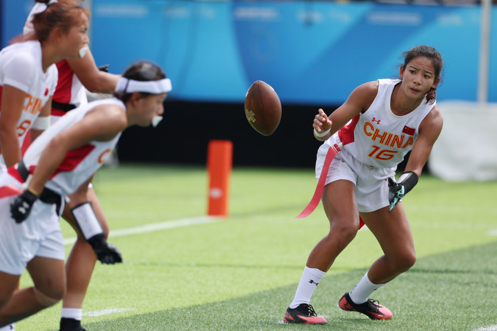 14日,腰旗橄欖球項(xiàng)目開賽。賽場上的激烈比拼與觀眾席上的“雄起”吶喊讓體育場“燃”起來。