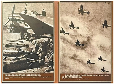 中國人民抗日戰(zhàn)爭紀(jì)念館中展示的蘇聯(lián)援華航空隊老照片。左側(cè)照片為蘇聯(lián)援華航空隊成員為飛機裝彈,準(zhǔn)備轟炸被日軍占領(lǐng)的臺北松山機場。右側(cè)照片為1938年中蘇空軍參加徐州會戰(zhàn)。